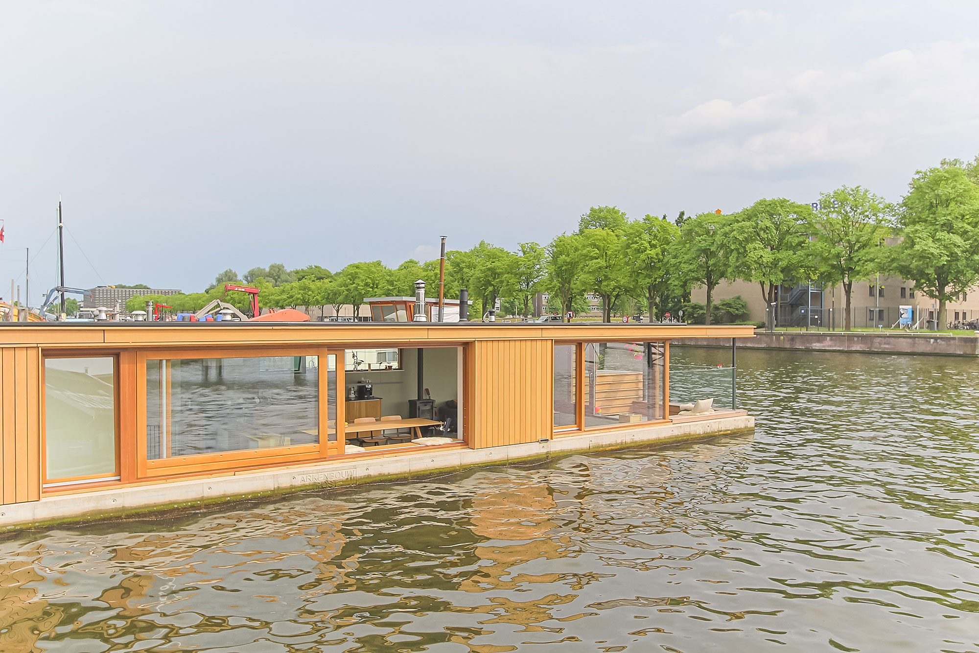 The layout of the houseboat seamlessly responds to the context of the location. At the location of the panoramic view of the Amsterdam skyline, the living space is situated with large windows that can be opened. The sills of the large windows are wide, so that they can be used as benches where you can enjoy the view of the skyline. The serving functions, such as the kitchen and the stove, are situated on the more closed east side of the houseboat.